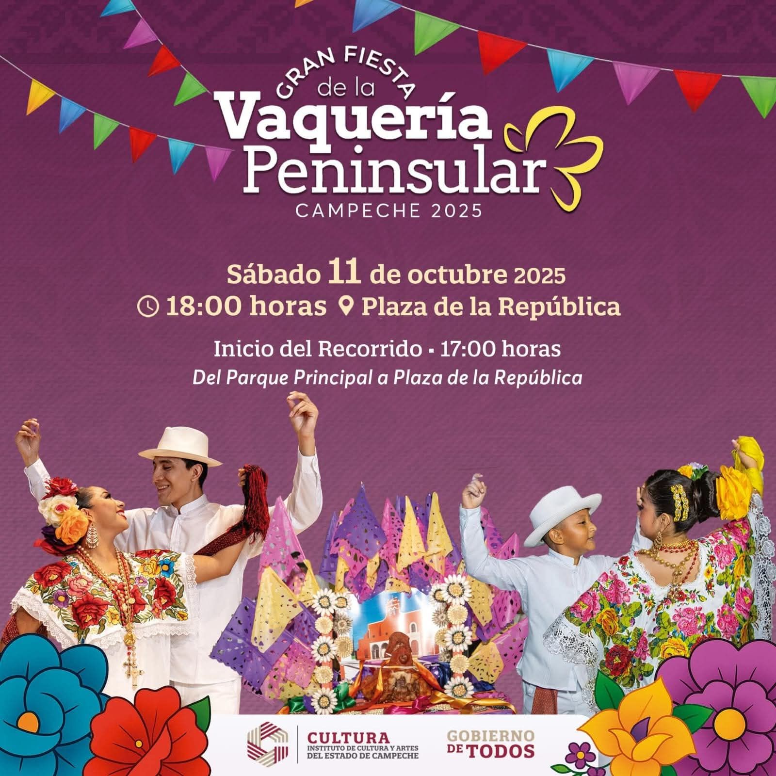 El Instituto de Cultura y Artes del Estado de Campeche invita a toda la ciudadanía a ser parte de la Gran Fiesta de la Vaquería Peninsular, un magno evento que celebra con alegría, color y orgullo una de las tradiciones más emblemáticas del sureste mexicano. Esta expresión del mestizaje maya-colonial reúne música, danza, vestimenta y espíritu comunitario, reafirmando el valor de nuestras raíces y la fuerza viva del patrimonio cultural campechano.