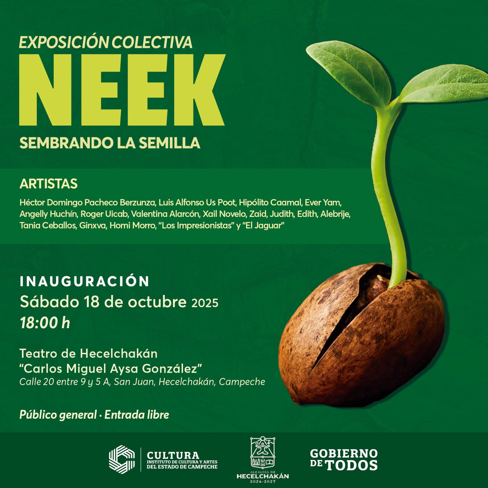 La Exposición Colectiva “Neek”, sembrando la semilla, abrirá sus puertas este sábado 18 de octubre a las 18:00 horas en el Teatro de Hecelchakán “Carlos Miguel Aysa González”, ubicado en la calle 20 entre 9 y 5ª San Juan. La muestra, cuyo nombre significa «semilla» en lengua maya, reúne a artistas con amplia trayectoria y jóvenes creadoras y creadores del municipio de Hecelchakán y sus comunidades en un espacio de diálogo intergeneracional a través de las artes visuales.