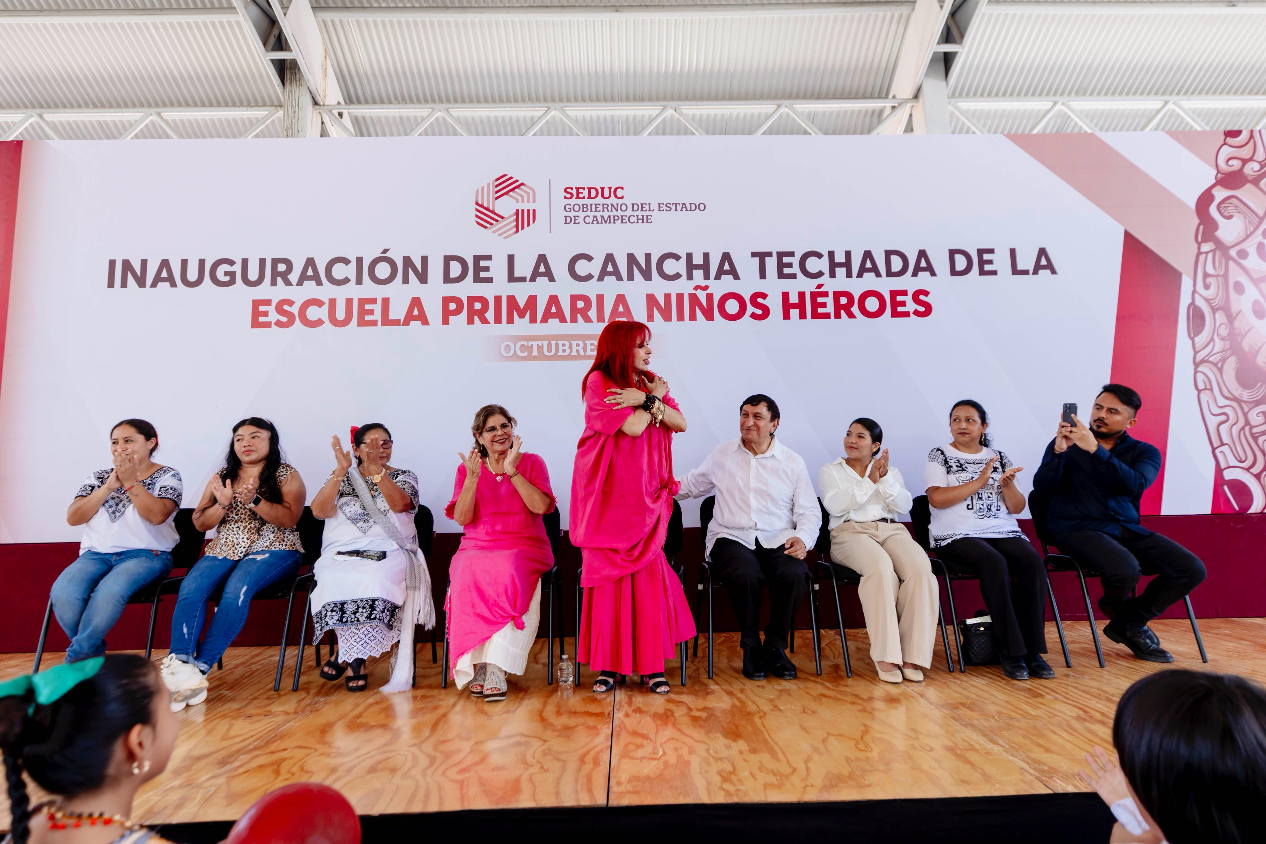 La Gobernadora Layda Sansores San Román encabezó la inauguración de la cancha techada de la Escuela Primaria “Niños Héroes” en la unidad habitacional Colonial Campeche, un espacio digno y seguro para el desarrollo deportivo y formativo de más de 600 niñas y niños de los turnos matutino y vespertino, con una inversión total de $4.3 millones.