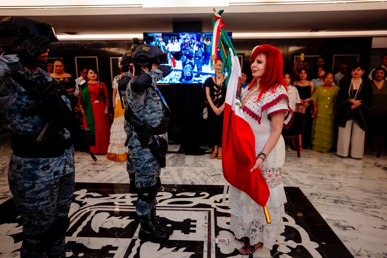 La gobernadora, acompañada de sus hermanas Laura, presidenta del Sistema DIF-Estatal, Libertad Sansores San Román, así como de los comandantes de la 33ª. Zona Militar, Alberto Román González Fernández, y de la Séptima Zona Naval, Alfredo Ramón Enríquez Delgado, y del comisario de la Guardia Nacional, Omar Díaz Alcaraz, ondeó el Lábaro Patrio en 12 ocasiones ante el multitudinario coro de miles de campechanos.