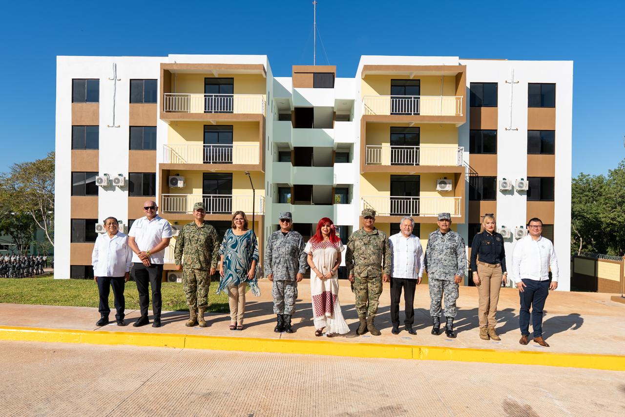 “Hoy es un gran día porque con satisfacción vemos inauguradas y puestas en funcionamiento estas instalaciones destinadas a las familias del personal de la Guardia Nacional acantonadas en esta ciudad de Campeche. Este espacio representa mucho más que viviendas”, expresó.