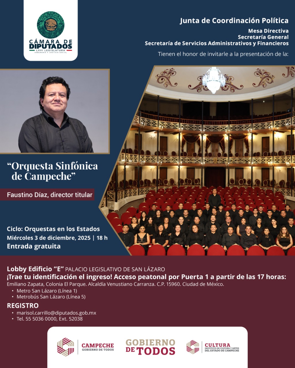 La Orquesta Sinfónica de Campeche, bajo la dirección del maestro Faustino Díaz, se presentará en el lobby del Edificio E del Palacio Legislativo de San Lázaro, Ciudad de México, como parte del Ciclo Orquestas en los Estados, el próximo miércoles 3 de diciembre de 2025 a las 18:00 horas. En este concierto, la OSCAM proyectará en su interpretación la riqueza musical campechana en el recinto legislativo federal.